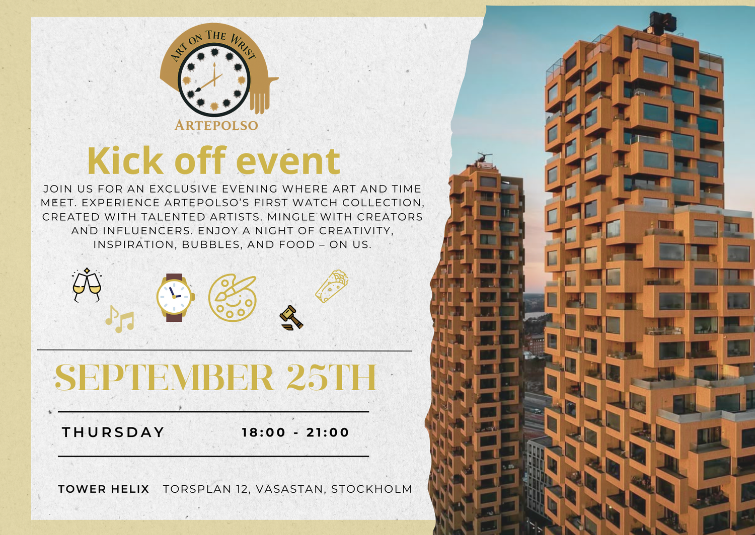 The ArtePolso Kick-Off Event marks the launch of our first watch collection. The collection is created in collaboration with selected artists and will be presented for the first time at Tower Helix in Stockholm. The evening will include an exhibition of the timepieces, networking within the art and design community, and the opportunity to place bids on the exclusive watches.